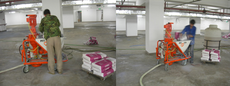 涂刷底涂剂现场施工图 基面上必须刷上底涂以防止自流平出现空洞和针眼。底涂采用自流平专用底涂,一般在基面上刷二次底涂。刷底涂之前应确保基面无明水。第一次,将专用底涂和水以1:6体积比勾兑,然后将底涂刷在基面上,确保基面上有足够的底涂;第二次,等第一遍的底涂干后将没有勾兑水的底涂按照1:4直接刷在地面上。等底涂干后才能浇注自流平材料。 三、 泵送和手工施工